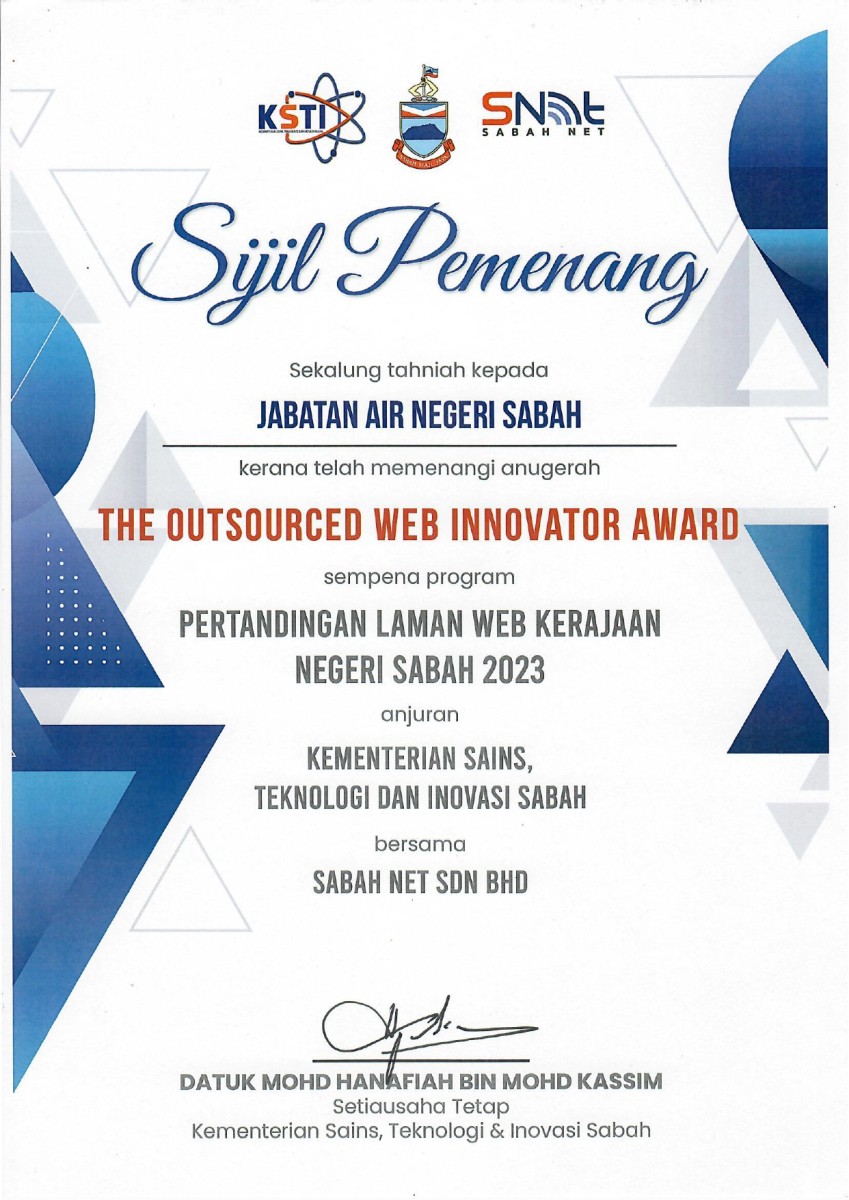 • SIJIL PEMENANG PERTANDINGAN LAMAN WEB KERAJAAN NEGERI SABAH 2023 (THE OUTSOURCED WEB INNOVATOR AWARD)