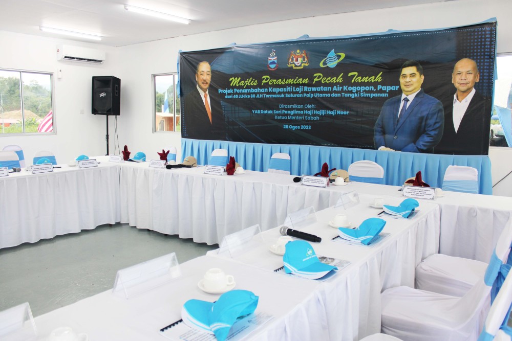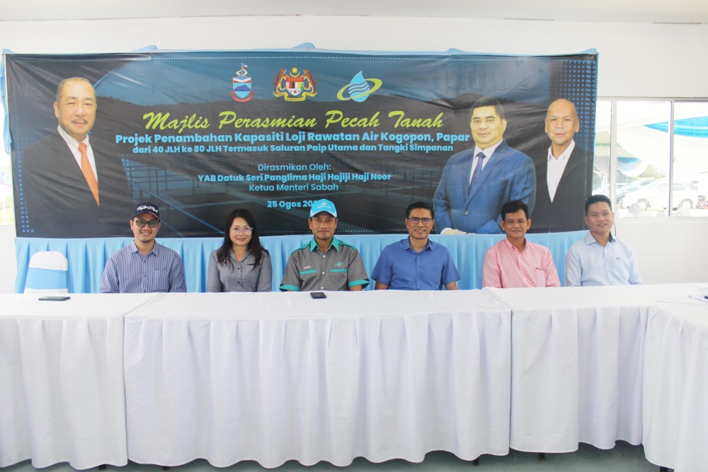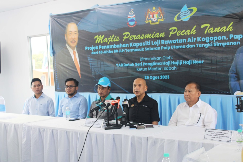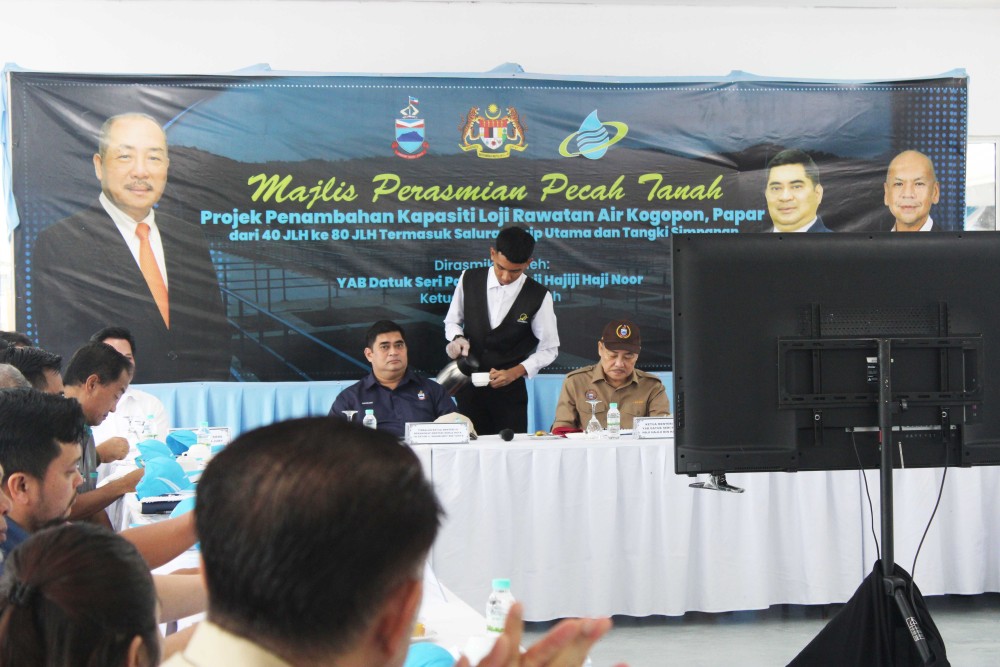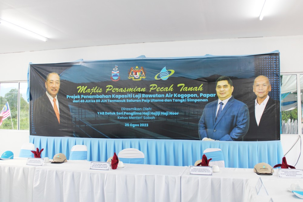 PAPAR - Tinjauan Lapangan Bagi Pelaksanaan Projek Penambahan Kapasiti Loji Rawatan Air Kogopon telah diadakan pada 25 Ogos 2023 (Jumaat) di Tapak Pembinaan Loji Rawatan Air Kogopon. Sesi Perasmian Pecah Tanah telah dirasmikan oleh Ketua Menteri Sabah, Yang Amat Berhormat Datuk Seri Panglima Haji Hajiji bin Haji Noor yang disaksikan oleh 200 orang kakitangan dari pelbagai agensi. Pihak konsultan mengadakan sesi pembentangan misi dan tujuan projek kepada YAB. Mengenai pelaksanaan Projek Penambahan Kapasti Loji Rawatan Air (LRA) Kogopon, YAB berkata, projek itu dapat meningkatkan kapasiti sedia ada daripada 40 juta liter sehari (JLS) kepada 80 JLS.