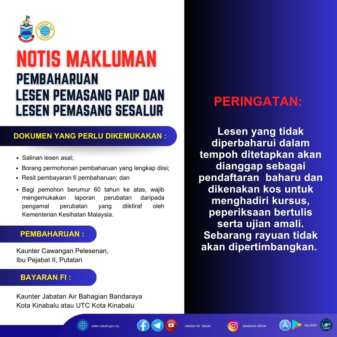 NOTIS MAKLUMAN PEMBAHARUAN LESEN PEMASANG PAIP DAN LESEN PEMASANG SESALUR
