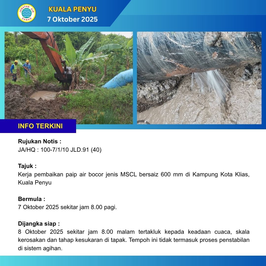 INFO TERKINI - KERJA PEMBAIKAN PAIP BOCOR JENIS MSCL BERSAIZ 600 MM DI KAMPUNG KOTA KLIAS, KUALA PENYU