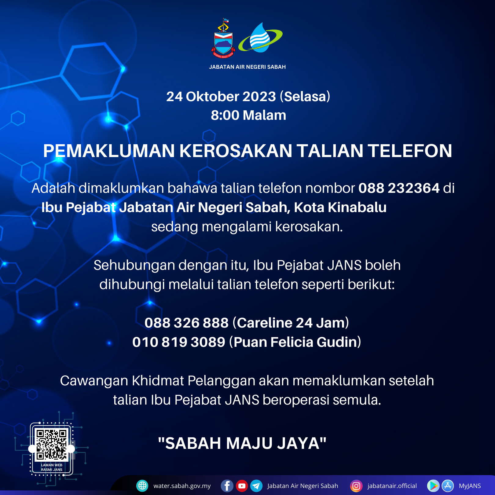 Adalah dimaklumkan bahawa talian telefon nombor 088 232364 di Ibu Pejabat Jabatan Air Negeri Sabah, Kota Kinabalu sedang mengalami kerosakan.