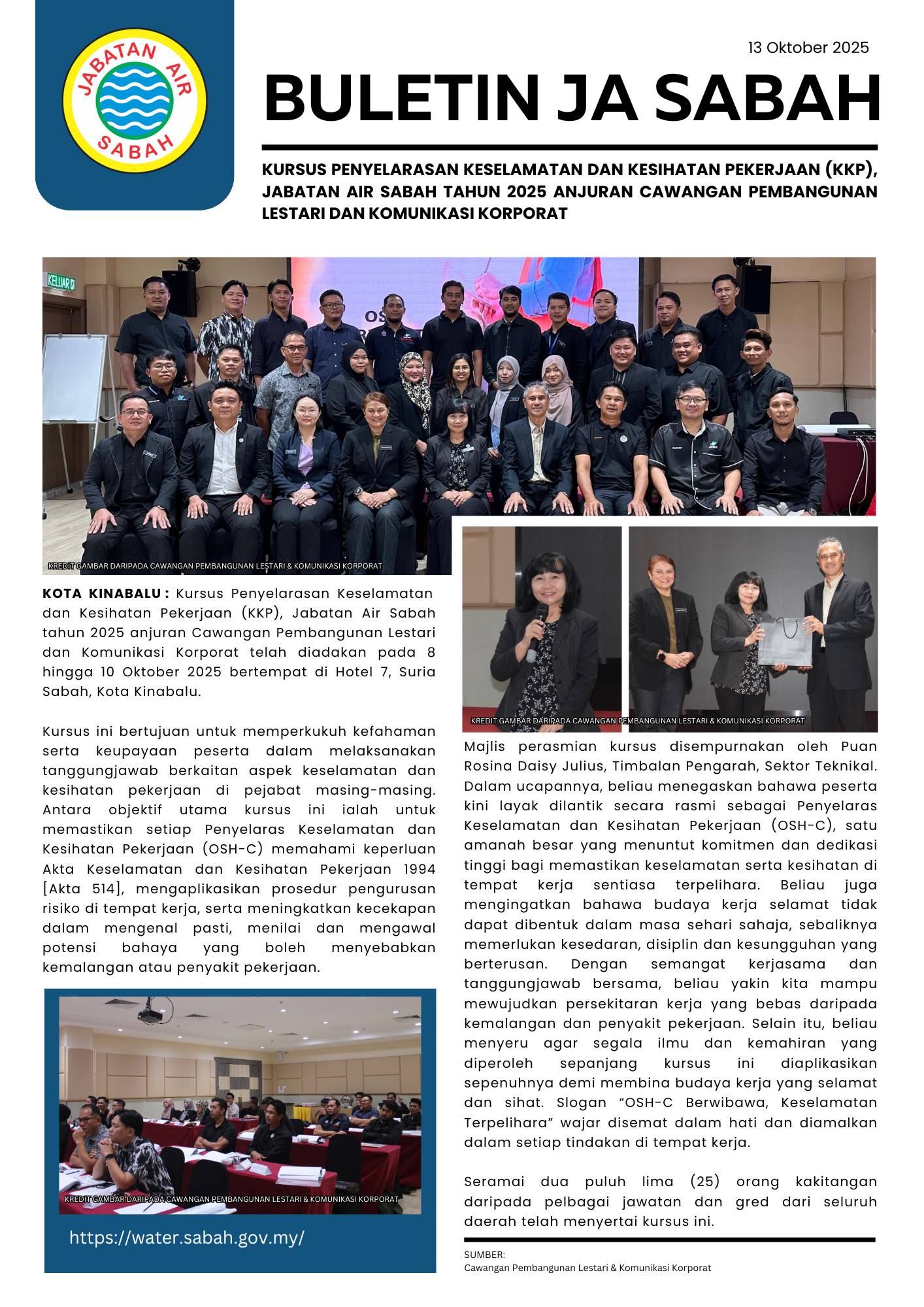 KURSUS PENYELARASAN KESELAMATAN DAN KESIHATAN PEKERJAAN (KKP), JABATAN AIR SABAH TAHUN 2025 ANJURAN CAWANGAN PEMBANGUNAN LESTARI DAN KOMUNIKASI KORPORAT