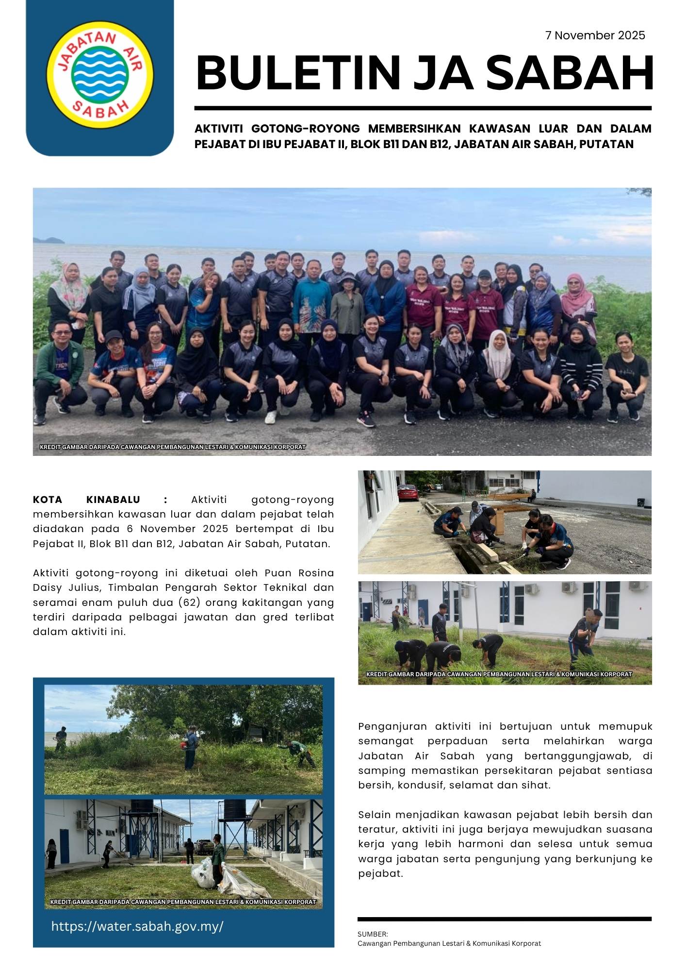 AKTIVITI GOTONG-ROYONG MEMBERSIHKAN KAWASAN LUAR DAN DALAM PEJABAT DI IBU PEJABAT II, BLOK B11 DAN B12, JABATAN AIR SABAH, PUTATAN