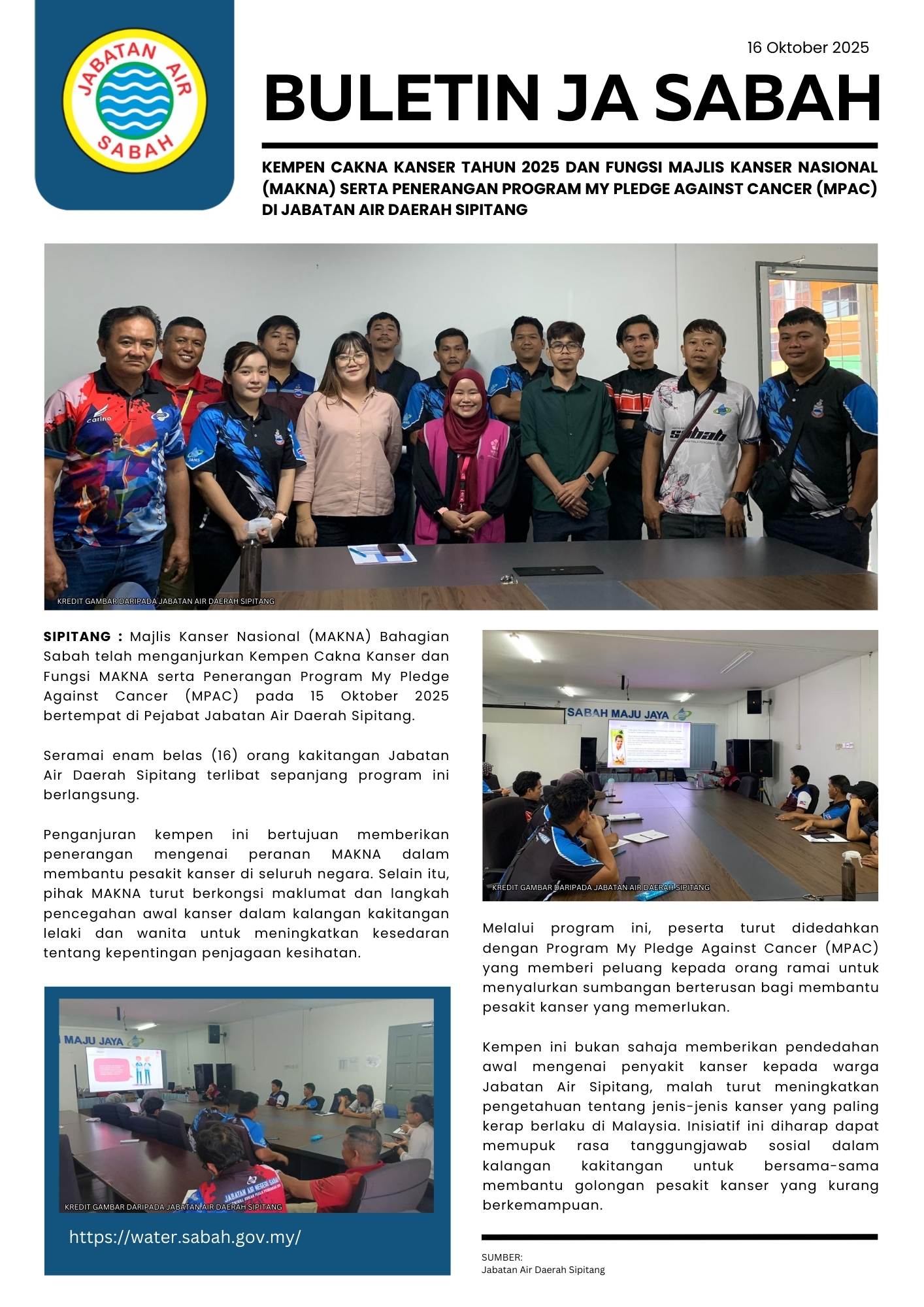 KEMPEN CAKNA KANSER TAHUN 2025 DAN FUNGSI MAJLIS KANSER NASIONAL (MAKNA) SERTA PENERANGAN PROGRAM MY PLEDGE AGAINST CANCER (MPAC) DI JABATAN AIR DAERAH SIPITANG