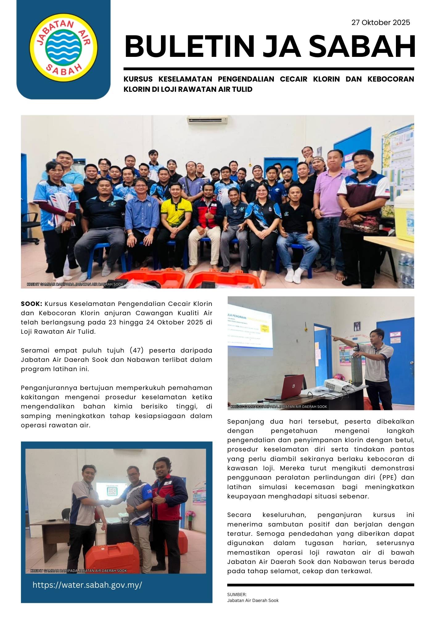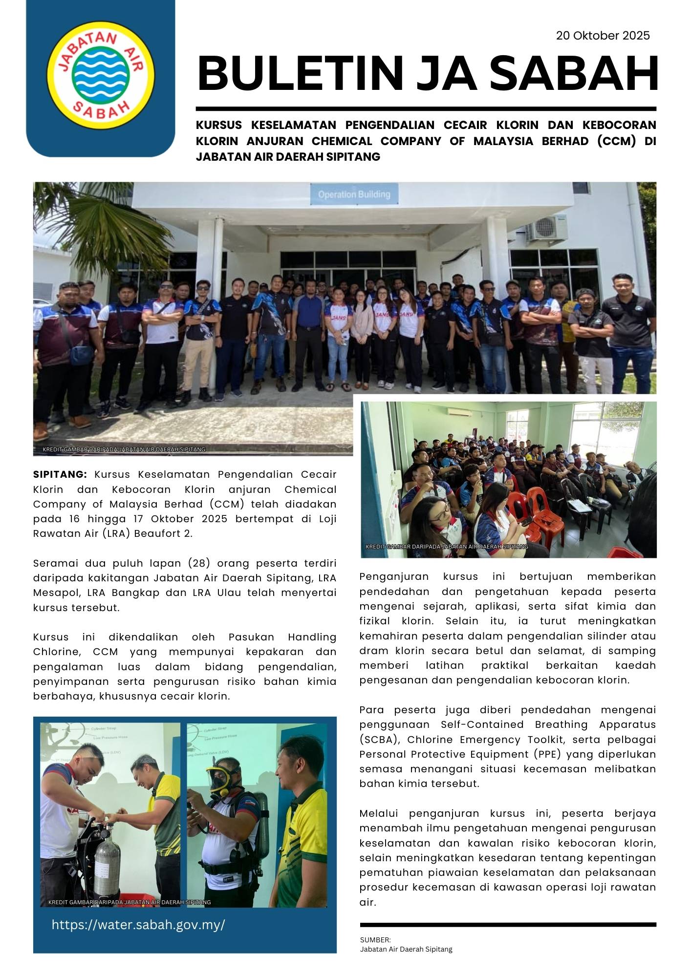KURSUS KESELAMATAN PENGENDALIAN CECAIR KLORIN DAN KEBOCORAN KLORIN ANJURAN CAWANGAN KUALITI AIR DI JABATAN AIR DAERAH PAPAR