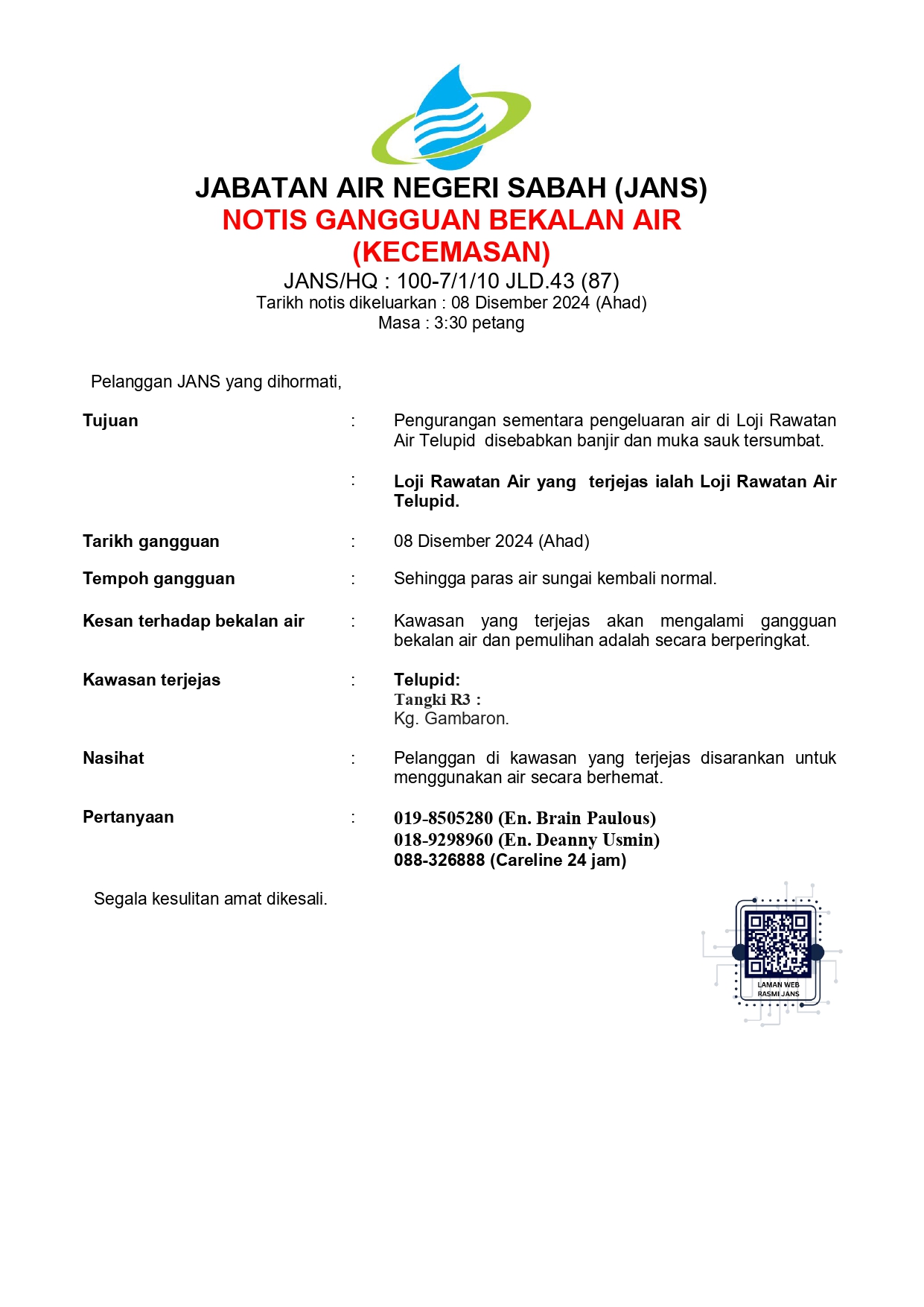 NOTIS KECEMASAN GANGGUAN BEKALAN AIR DI TELUPID