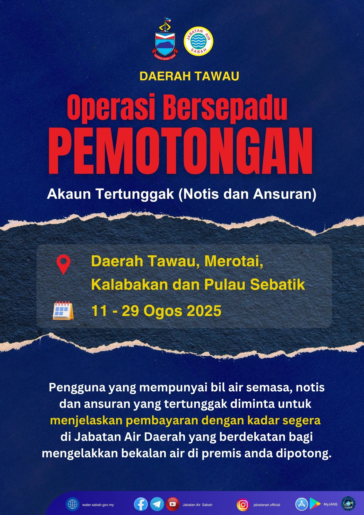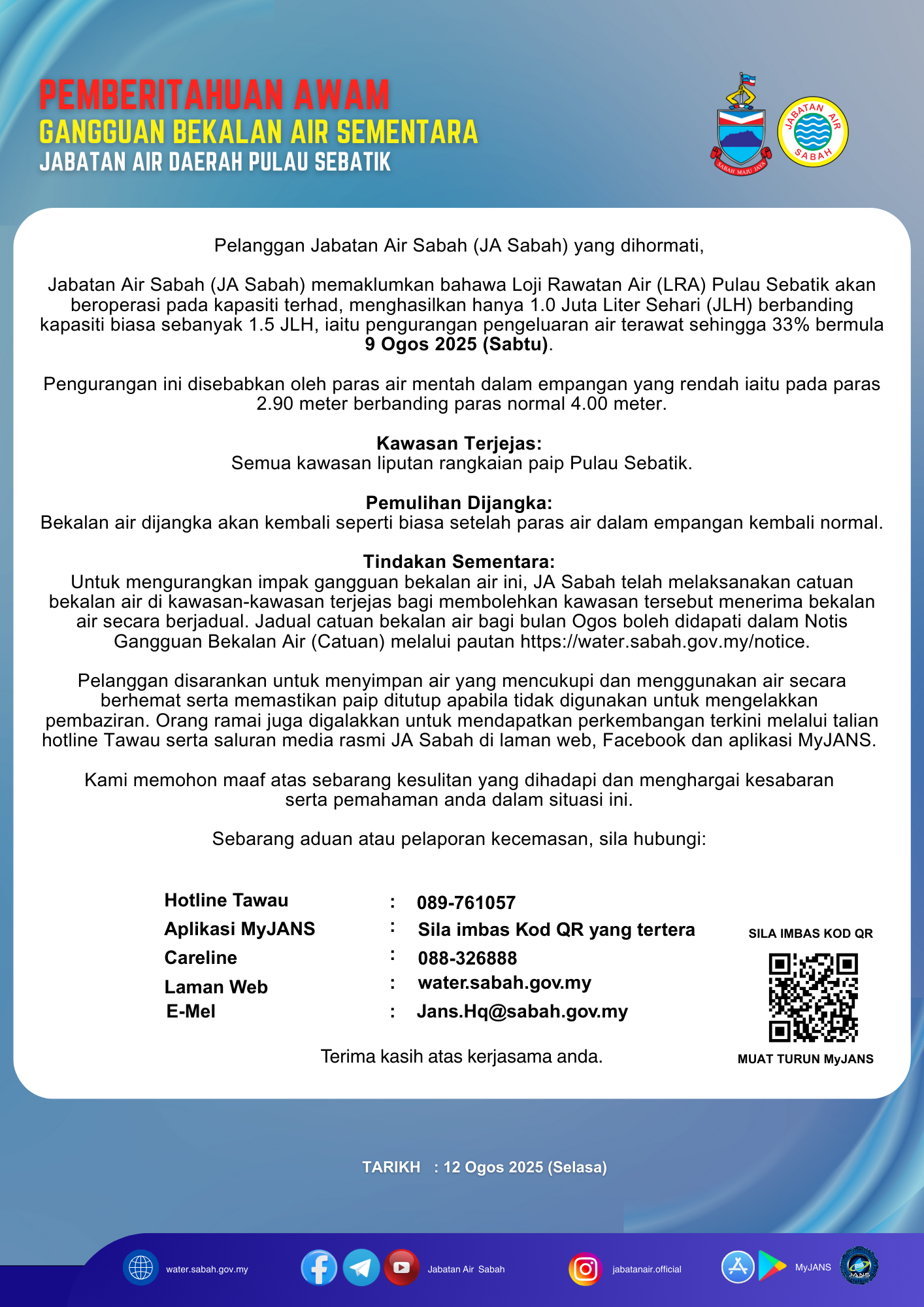 PEMBERITAHUAN AWAM GANGGUAN BEKALAN AIR SEMENTARA JABATAN AIR DAERAH PULAU SEBATIK