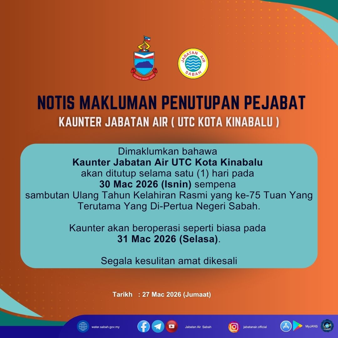 NOTIS MAKLUMAN PENUTUPAN PEJABAT (KAUNTER JABATAN AIR UTC KOTA KINABALU)