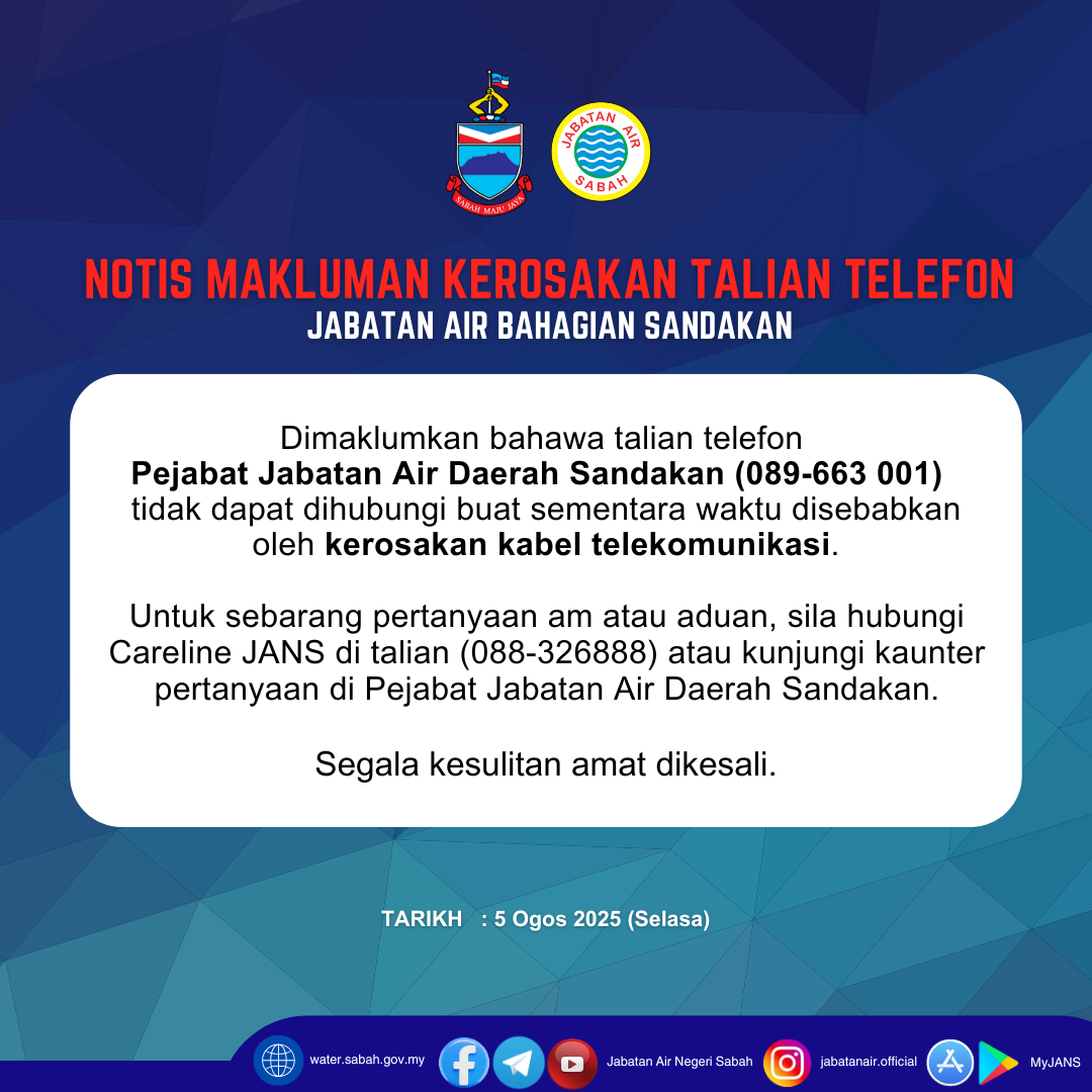 NOTIS MAKLUMAN KEROSAKAN TALIAN TELEFON JABATAN AIR BAHAGIAN SANDAKAN