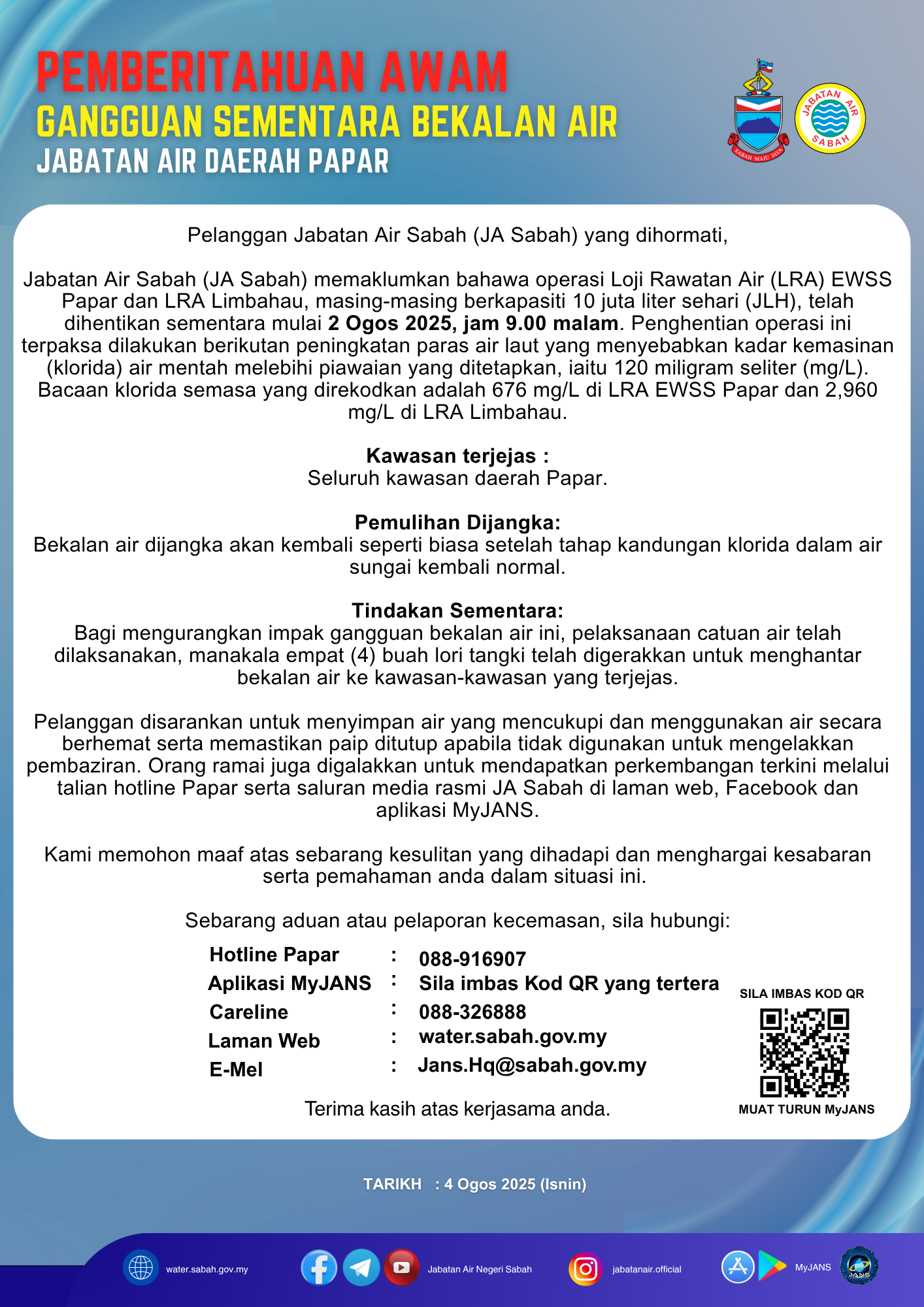 PEMBERITAHUAN AWAM GANGGUAN SEMENTARA BEKALAN AIR JABATAN AIR DAERAH PAPAR